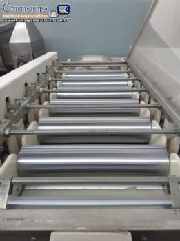 Cilindro de massas com 7 rolos.Marca: Toshiro.Em aço inox.Regulagem na altura dos cilindros: abertura até 4 mm.Esteira e sensores NR 12.Motor: 5 CV.Altura: 1.350 mm.Largura: 1.500 mm.Comprimento: 2850 mm.Peso: 3.500 Kg.